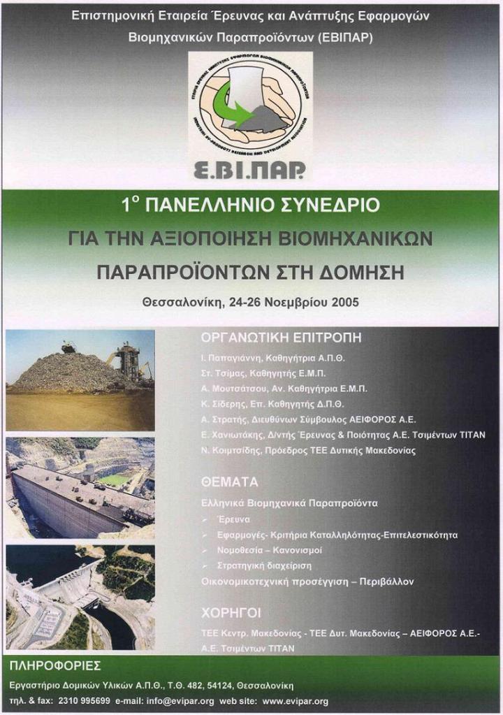 Το 1ο ΠΑΝΕΛΛΗΝΙΟ ΣΥΝΕΔΡΙΟ ΓΙΑ ΤΗΝ ΑΞΙΟΠΟΙΗΣΗ ΒΙΟΜΗΧΑΝΙΚΩΝ ΠΑΡΑΠΡΟΪΟΝΤΩΝ ΣΤΗ ΔΟΜΗΣΗ που διοργανώθηκε από την ΕΒΙΠΑΡ, πραγματοποιήθηκε στη Θεσσαλονίκη, 24-26 Νοεμβρίου 2005.